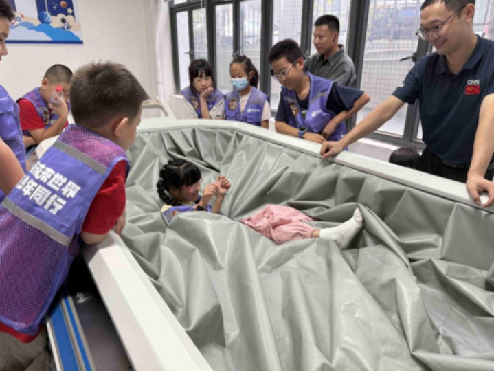 “离心机转起来时有点害怕,但下来后觉得特别酷!像真的航天员一样!”“我最喜欢干浸水槽失重体验项目,不借助外力根本站不起来,仿佛感受到了宇航员叔叔阿姨在太空中的失重状态,太神奇了!”在南方太空院,刚刚体验完超重耐力训练与模拟失重环境的小学员兴奋地分享道。